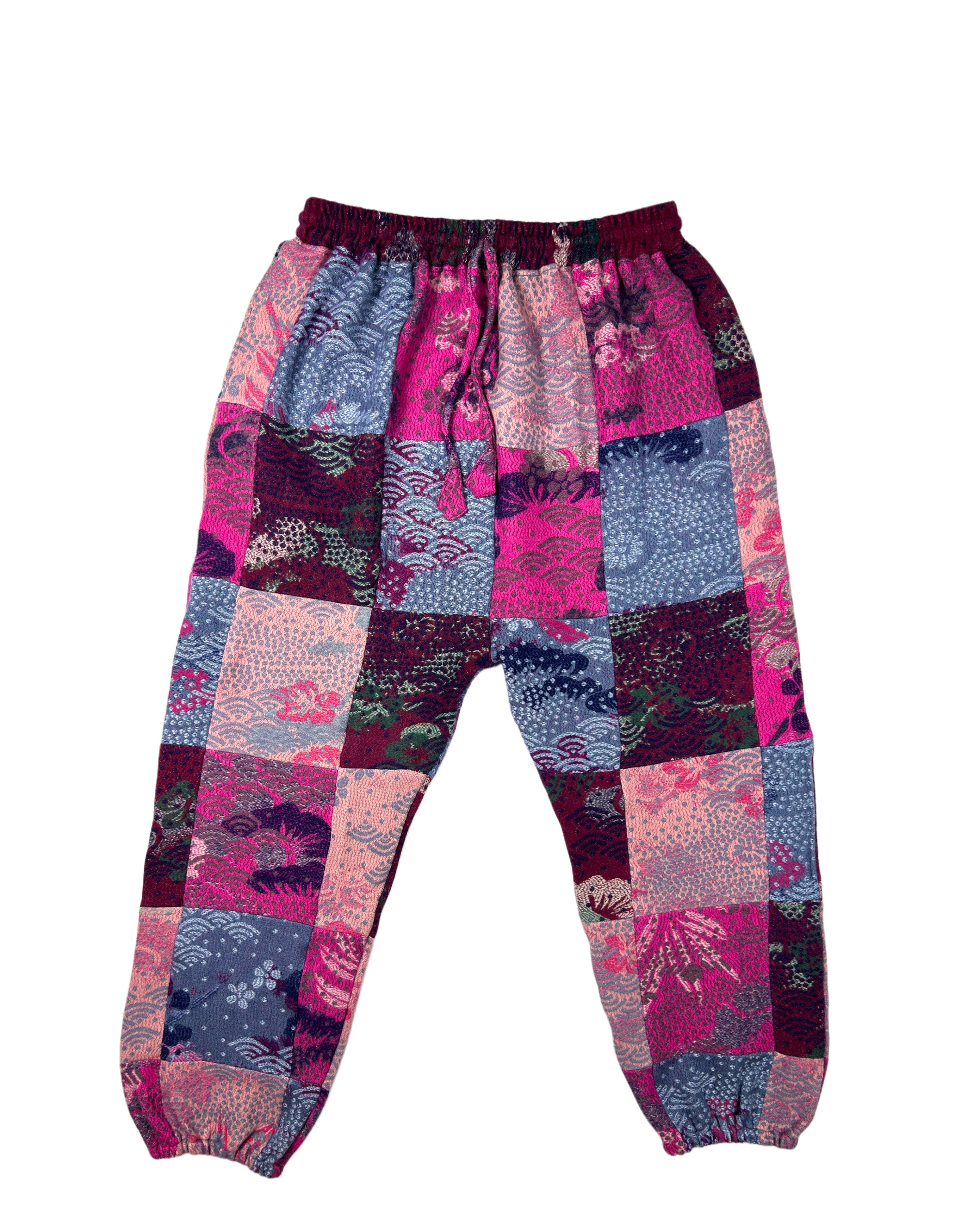 • Unisex patchwork harem pants made of thick fleece-like material.