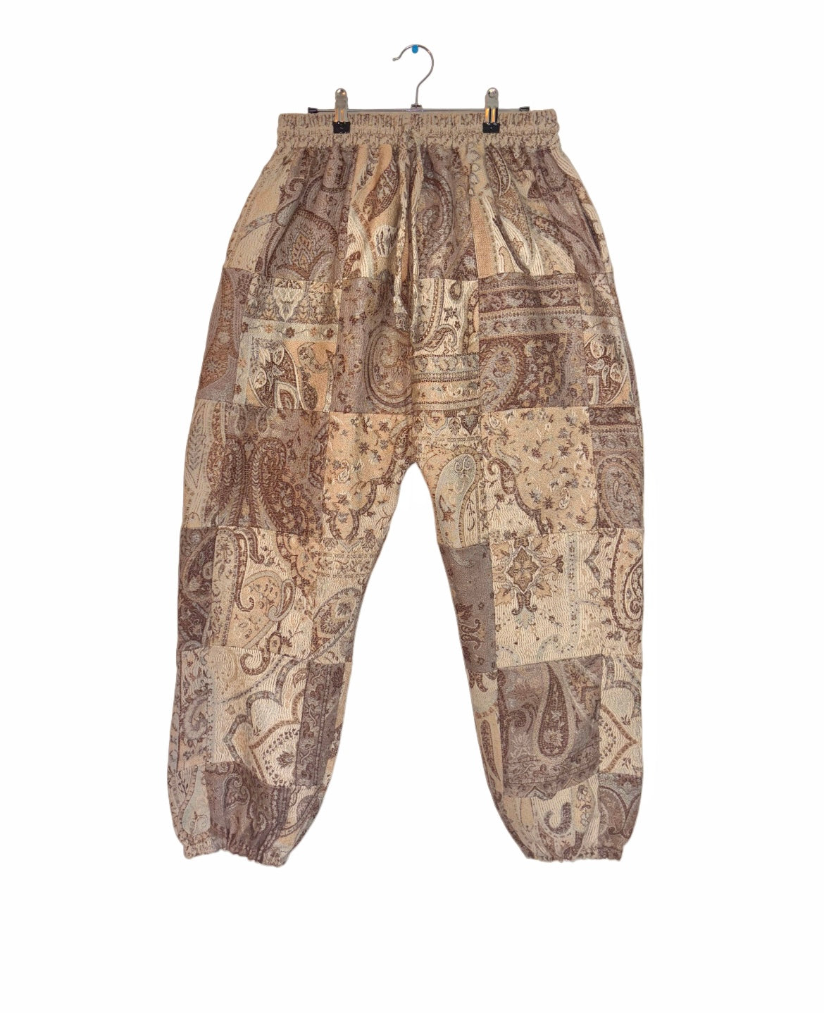 • Unisex patchwork harem pants made of thick fleece-like material.